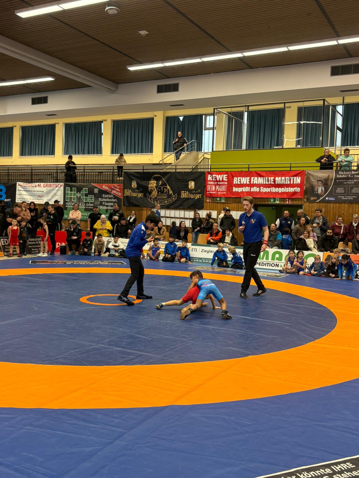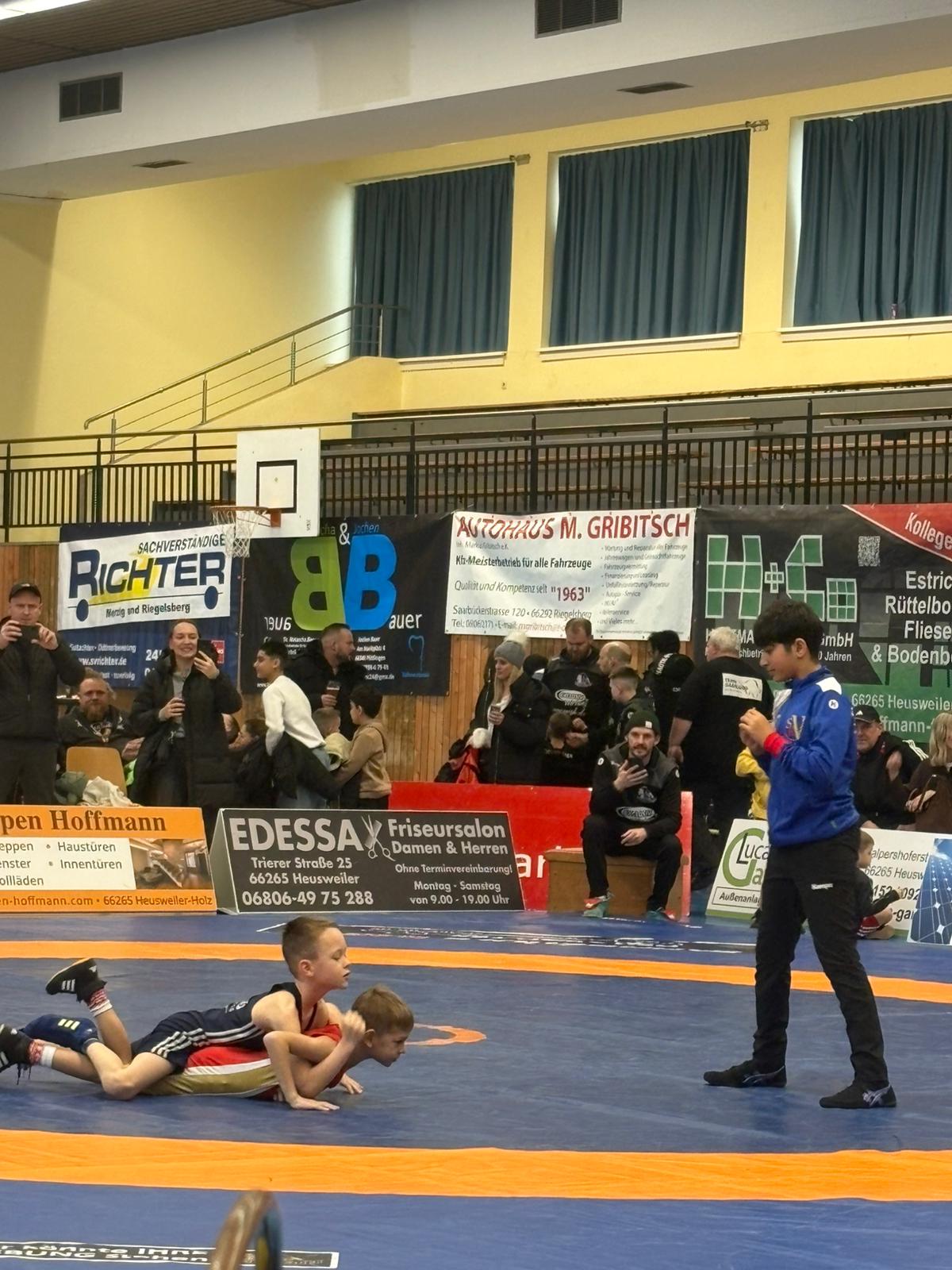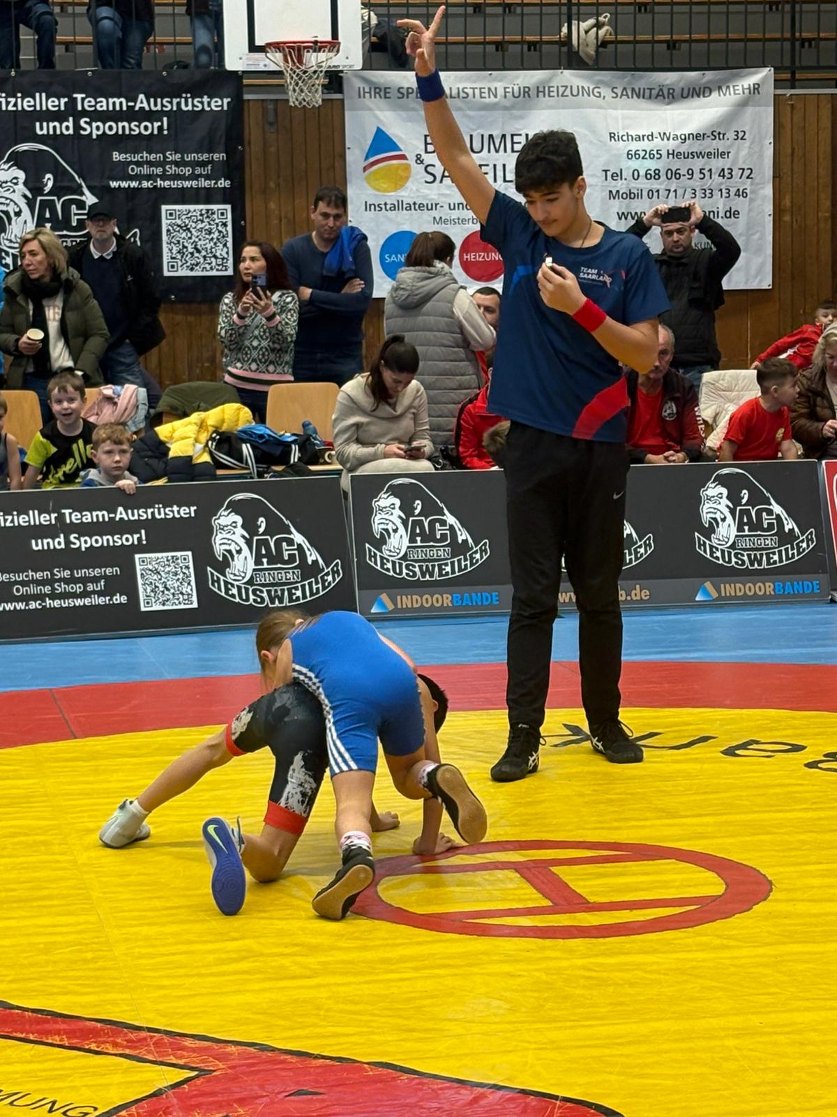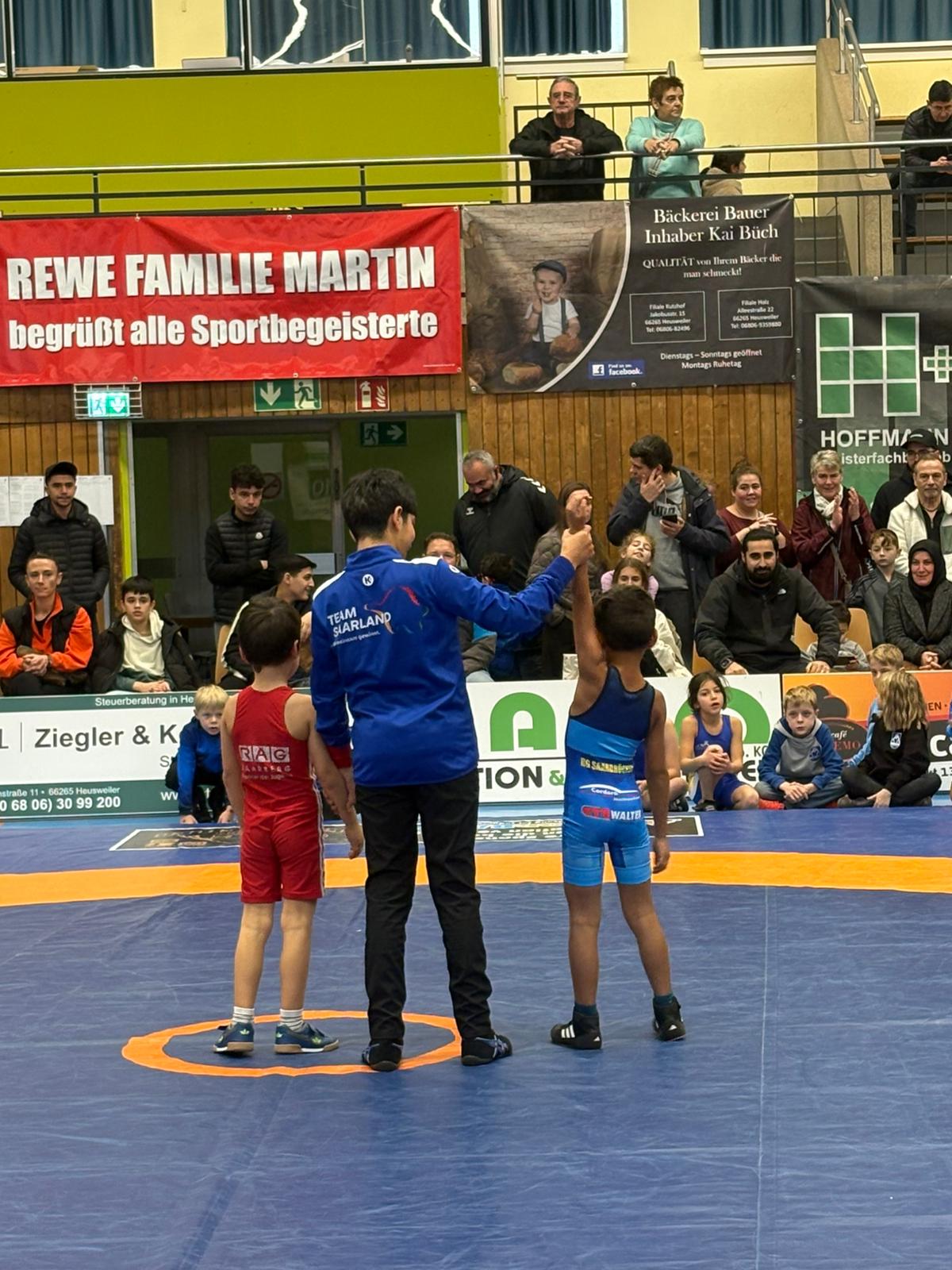 Den Anfängern eine Bühne bieten – das ist das Motto des Fun-Turniers des SRV, welches am vergangenen Nikolaus-Samstag (6. Dezember) zum zweiten Mal ausgetragen wurde. In der Sporthalle der Schillerschule in Heusweiler trafen sich insgesamt 70 junge Ringerinnen und Ringer, um unter vereinfachten Regeln ein Turnier zu bestreiten. „Wir wollen mit diesem Turnier erreichen, dass nur Anfängerinnen und Anfänger gegeneinander kämpfen, damit jeder und jede in etwa das selbe Niveau. Damit steht auch mehr der Spaß als der Erfolg im Mittelpunkt“, so SRV-Breitensportreferent Michael Hentges, der maßgeblich für die Organisation dieser Maßnahme verantwortlich war. Dementsprechend ist in der Turnierausschreibung auch verankert, dass lediglich diejenigen Athletinnen und Athleten an diesem Turnier teilnehmen dürfen, die erst höchstens ein Jahr einen Ringerpass besitzen. Damit jeder Teilnehmer und jede Teilnehmerin auch möglichst viel Wettkampfpraxis sammeln konnte, wurde bis auf das Verlassen der Mattenfläche (1 Punkt) jede Aktion mit 2 Punkten bewertet, auch ein Schultersieg beendete den Kampf nicht vorzeitig. Somit wurde sichergestellt, dass jeder Kampf genau 2 Minuten Kampfdauer besaß. Auch im Schiedsrichterteam durfte sich wie im vergangenen Jahr der ein oder andere Nachwuchssportler des SRV mal an der Pfeife probieren. „Elias, Seif und Fares haben unsere erfahrenen Kampfrichter Georg, Maurice und Yannik einwandfrei unterstützt, dafür ein großes Dankeschön“, so das Lob des Breitensportreferenten.