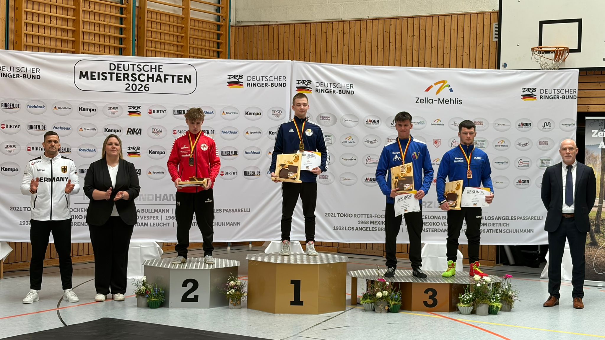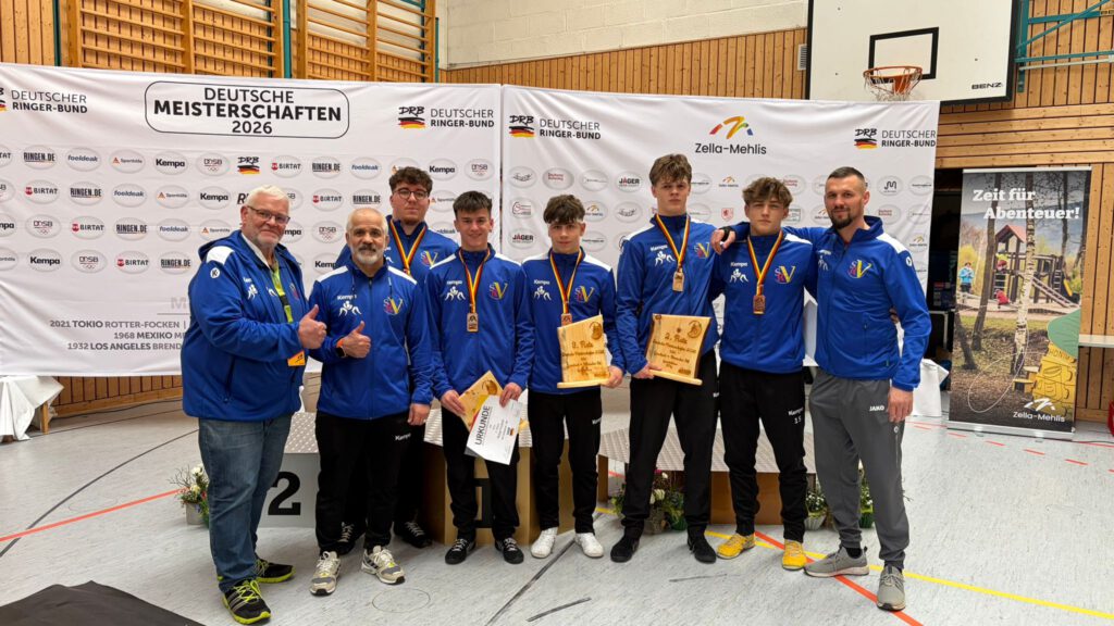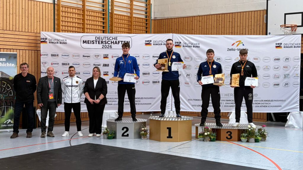 Wenig später jubelten zwei weitere Saarringer: Leander Bode (AC Heusweiler / 82kg) gewann ebenfalls per Schultersieg über Noel Luka Lozancic (Württemberg) und der Riegelsberger Johannes Müller machte beim 8:0 gegen Adrian Aras Safari (Württemberg) kurzen Prozess im Schwergewicht bis 130kg. Einzig Kevin Titov vom ASV Hüttigweiler musste sich im Bronzekampf geschlagen geben. Er verlor mit 0:9 gegen den Bayer Jonas Zimmermann und belegte nach insgesamt gutem Turnier den undankbaren 5. Platz in der Klasse bis 77kg. „Vor allem am Sonntag haben mir die Leistungen der Sportler gefallen, da haben wir gute Kämpfe gezeigt. Bei all der Freude muss man aber auch realistisch sein: All unsere Kämpfe, die wir verloren haben, haben wir deutlich verloren. Ein Titel ist noch ein gutes Stück weg gewesen. Aber wir haben die richtige Tendenz. Mit dem guten Teamergebnis im Rücken erhoffe ich mir einen Motivationsschub für die kommende Zeit, dann können wir eventuell in den kommenden Jahren auch wieder einen Meister stellen – das wäre mein Wunsch“, analysiert Landestrainer Albert Nurov das Mannschaftsergebnis im Greco-Bereich. Weitere Starter in Zella-Mehlis waren Enes Sakrak (RG Saarbrücken / 97kg / Platz sieben), Nikita-Finn Frehse (KV Riegelsberg / 60 kg / Platz zehn) und Maximilian Kohl (KV Riegelsberg / 77kg / Platz zwölf). Sie mussten sich allerdings in ihren Auftaktbegegnungen geschlagen geben und schieden leider aus.